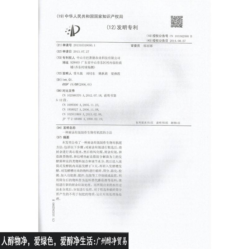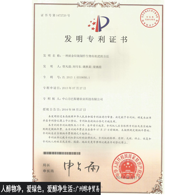 團隊項目中的有機肥項目近下來的一份發明專利證書,發明名稱:一種廚余垃圾制作生物有機肥的方法,作為無公害綠色有機種植項目一條龍的配套保證,我們團隊一直在努力前進中,如有朋友想找我們團隊合作,用上我們其他變廢為寶的有機肥專利技術,我們可以詳談,我們擇優選取合作伙伴。