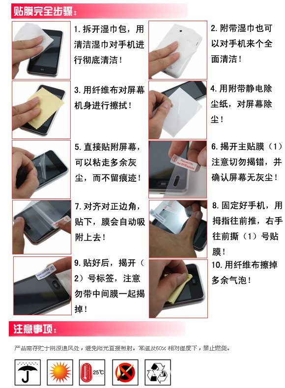 步驟一:用送的屏擦布將液晶屏幕上的指紋、塵埃,油點及污垢試去切記務必擦干凈才能動手上貼膜。