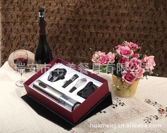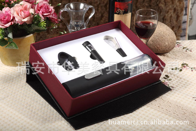 3、充電電動開瓶器套裝配置有充電電動開瓶器、割紙器、真空酒塞、充電器、倒酒器,并配有精美的木皮盒包裝。