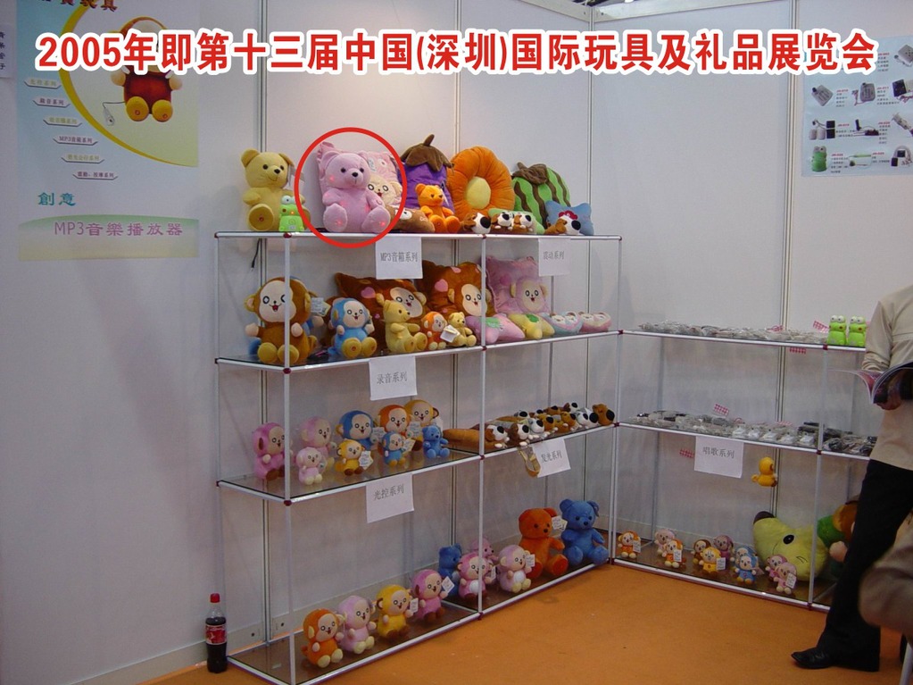 我廠專營電子產品玩具,早在2005年的中國深圳國際玩具展覽會上,已大量生產和銷售LED發光系列,振動,按[mo]系列,錄音系列,MP3系列音箱的產品,有展覽會的圖片和資料為證并申請多項的商標、專利、產品實用新型專利,專利申請號為:0474.2 5627.8