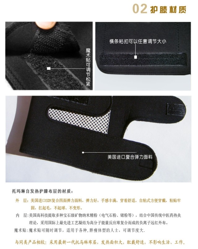 遠紅外負離子熱能護膝采用巴西寶石托瑪琳、納米功能陶瓷粉及特殊的熱感應材料復合而成。在人體體溫的激發下,通過轉移觸媒的作用,熱感應材料即時反應放出熱量。