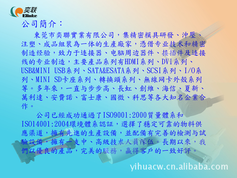 奕聯于2006年生產銷售Displayport 板端 線端連接器 轉接頭及線纜組裝。產品用于解決顯卡與Monitor高清解析度的要求。