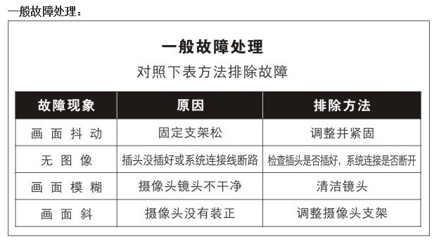 攝像頭工作電源壓超過12V或正負極性接反有可能燒壞芯片,非專業人員請慎重安裝!部分車型如倒車燈電壓不穩定或低于12V,可加裝繼電器從ACC給攝像頭供電解決。