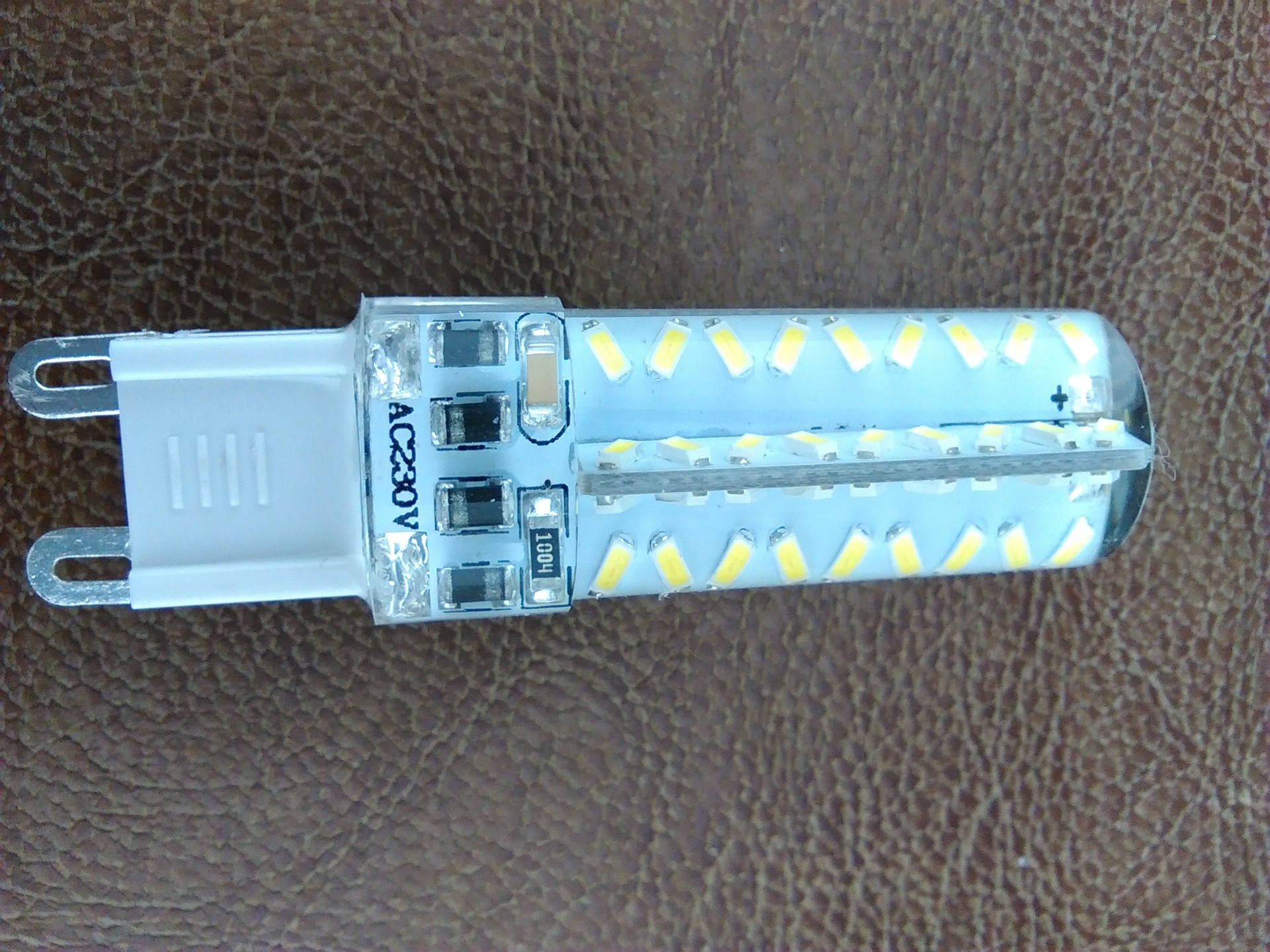 AC220V——名稱—— LED-G9燈泡硅膠4W ——材質——優質散熱灌膠。顏色——色溫:正白(6000-6400k)/暖白(2700-3200k)——尺寸——直徑16*60mm,包含引腳——屬性——功率:4.5W,電壓:220V,發光角度:300度,溫度: -20℃~40℃,壽命:>30,000H ——特點——節能環保,高亮度,低功耗,色溫一致性好,光色恒定,光通維持率高,壽命長,耐用不變色!燈體采高透光導熱硅膠,散熱燈身,優質散熱系統,耐高溫與散熱性能佳!——安裝——直接替換鹵素G9燈珠,拔下G9燈泡,換上此款G9LED燈泡,就可以正常工作!——用途——所有G9的燈頭均可使用,居家、酒店、餐廳、展廳等室內裝飾照明——注意——更換燈泡時應保持開關處于斷開狀態;非專業人士請勿自行拆解