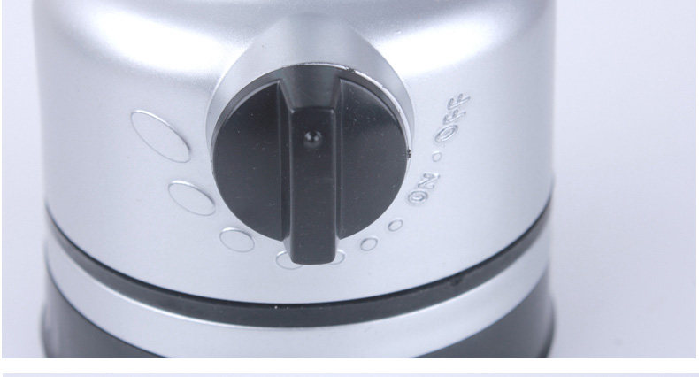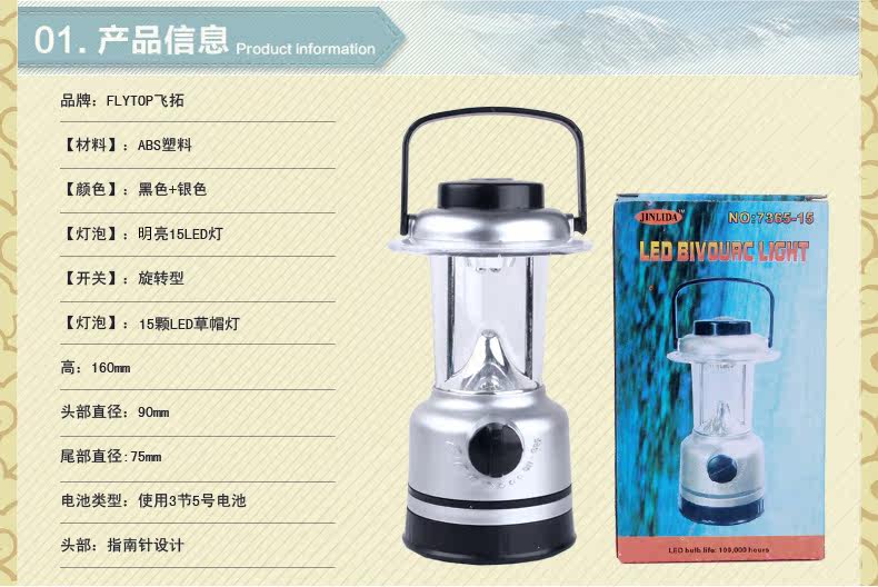 頭部:指南針設計1.ABS材料表面銀色。2.使用普通3節5號電池,耗電極省,使用旋轉型開關;燈光亮度可根據自己的需求調節開關燈亮;可連續照明40小時左右(間斷使用時間更長),照射范圍在10平方米左右的房間可清晰照亮整個房間。3.LED燈泡壽命極長,可使用10萬小時,不必考慮更換燈泡的問題。4.可防雨水,輕松應對野外惡劣環境。(注:不能潛水時使用)5.適合露營,釣魚,燒烤,停電使用,臺燈頂部有掛鉤可掛在帳篷頂部當帳蓬燈使用,頭部指南針設計。尺寸規格:高:160mm 頭部直徑:90mm底部直徑:75mm功能簡介:1.使用普通3節5號電池,耗電極省,使用旋轉型開關;燈光亮度可根據自己的需求調節開關燈亮;可連續照明40小時左右(間斷使用時間更長),照射范圍在10平方米左右的房間可清晰照亮整個房間。2.LED燈泡壽命極長,可使用10萬小時,不必考慮更換燈泡的問題。3.可防雨水,輕松應對野外惡劣環境。(注:不能潛水時使用)4.適合露營,釣魚,燒烤,停電使用,臺燈頂部有掛鉤可掛在帳篷頂部當帳蓬燈使用。頭部指南針設計,戶外使用跟貼心5.15顆高亮草帽型白光發光二極管(LED),真正的環保綠色光源,原材料無污染,生產無污染,低功耗,如此亮度,功耗卻不到1W(0.75W),可大大減少電池的使用量6、小巧的體積更易于外出攜帶