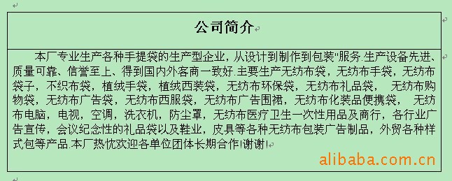 本廠專業生產各種手提袋的生產型企業,從設計到制作到包裝'服務.生產設備先進、質量可靠、信譽至上、得到國內外客商一致好.主要生產無紡布袋,無紡布手袋,無紡布袋子,不織布袋,植絨手袋,植絨西裝袋,無紡布環保袋,無紡布禮品袋, 無紡布購物袋,無紡布廣告袋,無紡布西服袋,無紡布廣告圍裙,無紡布化裝品便攜袋, 無紡布電腦,電視,空調,洗衣機,防塵罩,無紡布醫療衛生一次性用品及商行,各行業廣告宣傳,會議紀念性的禮品袋以及鞋業,皮具等各種無紡布包裝廣告制品,外貿各種樣式包等產品.本廠熱忱歡迎各單位團體長期合作!謝謝!