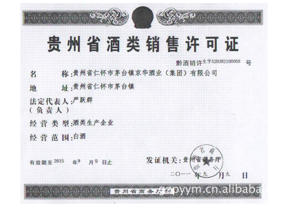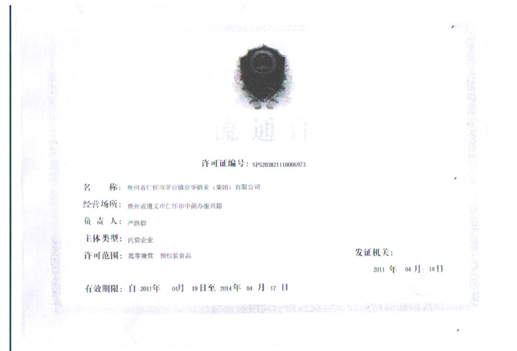 酒廠已通過ISO9001國際質量管理體系認證和HACCP食品安全管理體系認證。生產許可證編號:QS5200 1501 0056食品衛生許可證:黔衛食證字[2009]第520382-161084號