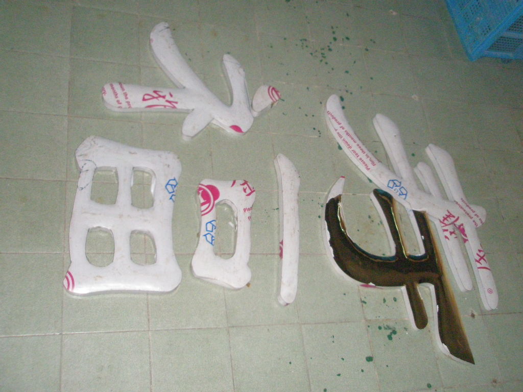 三)下料:把字稿直接貼在鈦金字板上,也可把字稿摹在鈦金板上,字稿四周適應地留出余量,否則字變細,變瘦,然后用電剪子剪成平字