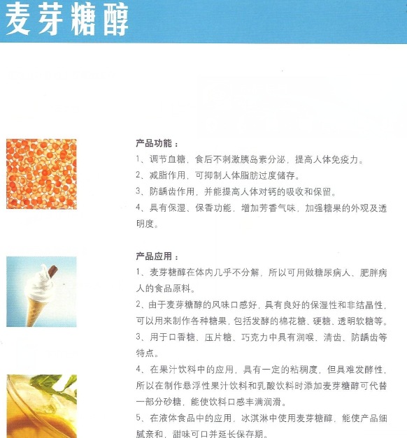 冰淇淋中使用麥芽糖醇,能使產品細膩稠和,甜味可口,并延長保存期。