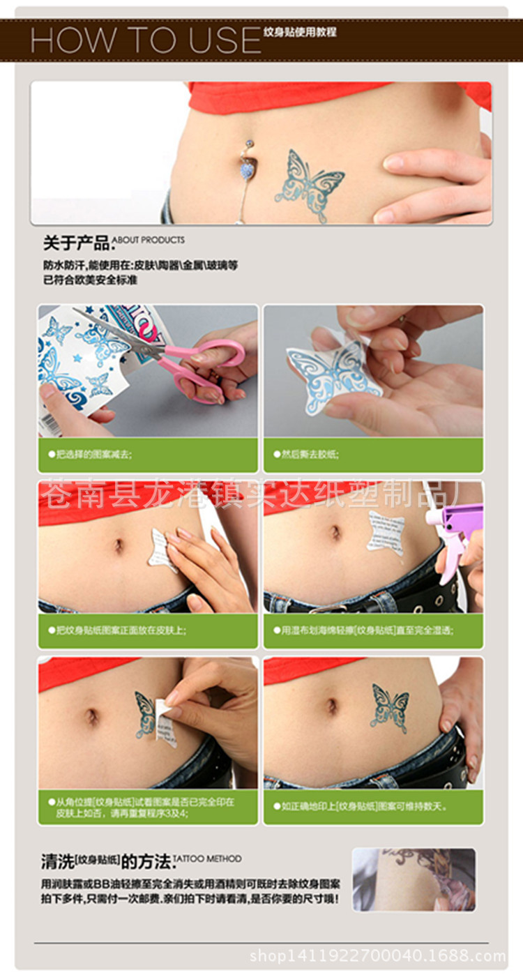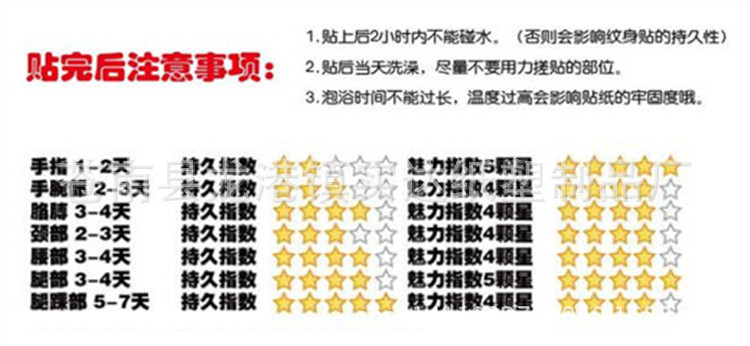 紋身貼使用簡單方便,沒有痛苦,貼上可以保持一個星期,不怕水洗,對皮膚
