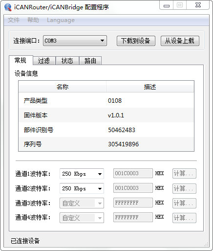 iCANHub-P4可通過異步串行通訊接口連接到PC來配置。通過iCANgw.exe配置軟件設置CAN通道波特率、CAN消息接收濾波等,使用簡單,支持即時生效,設備配置完成后無需任何操作即可投入工作。