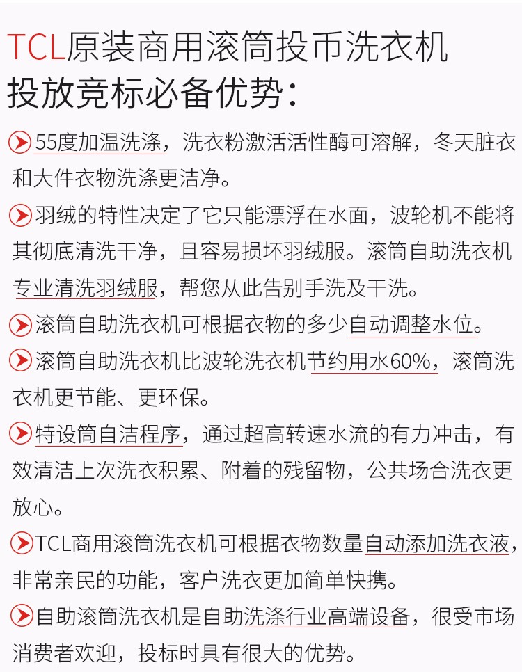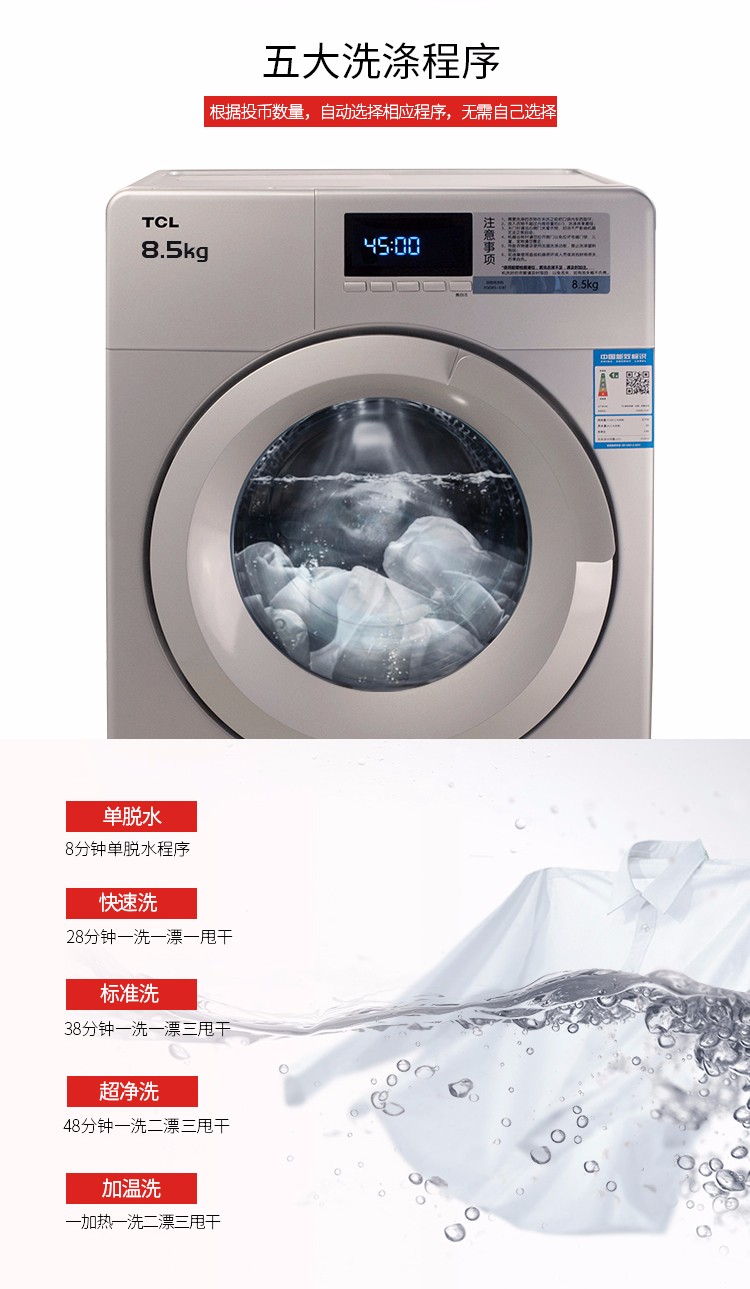 TCL商用原裝洗衣機,有筒自潔,單脫,快洗,標準,大物,加溫6種程序組合,滿足顧客多樣化洗滌需求。投幣式、刷卡式、無線支付更多支付方式應有盡有。使投放者擁有更多選擇,還可對接校園一卡通,專屬為您定制。
