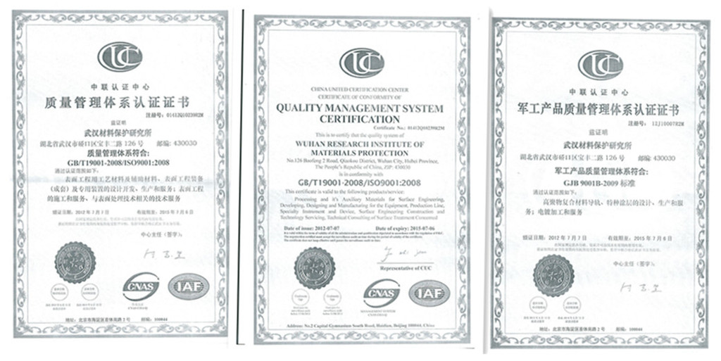 武漢材料保護研究所始建于1953年,原為機械工業部直屬大型骨干研究所,隨著我國科技體制改革的發展,轉制為科技型企業,現隸屬于國務院國有資產管理委員會管理的機械科學研究總院。經過50余年的發展,武漢材料保護研究所已成為表面處理工藝、材料、設備的研發與生產,表面覆蓋層性能測試、產品質量檢測,表面保護工程設計與施工的高新技術企業,并通過GB/T19001-2008/ISO9001:2008質量管理體系認證,GJB9001B-2009軍工產品質量管理體系認證。