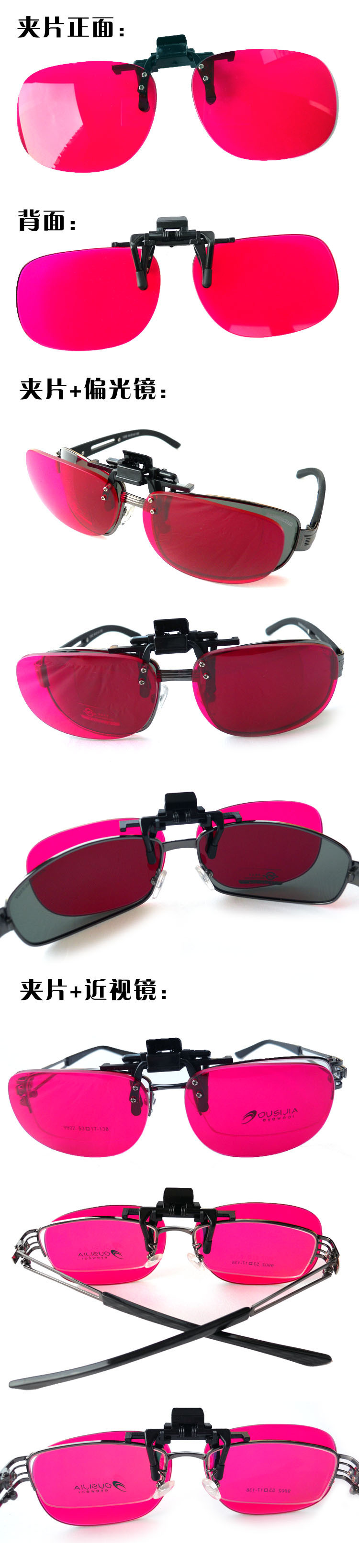 此夾片專門針對色盲色弱設計,佩戴使用方法同普通的偏光夾片一樣。摘戴非常方便,不需要用的時候可自行隨時摘下便可,也可很好保護消費者隱私。尤其適合于有近視、遠視、散光等因特殊難度不宜定制的框架鏡片,但又需要配戴的朋友。