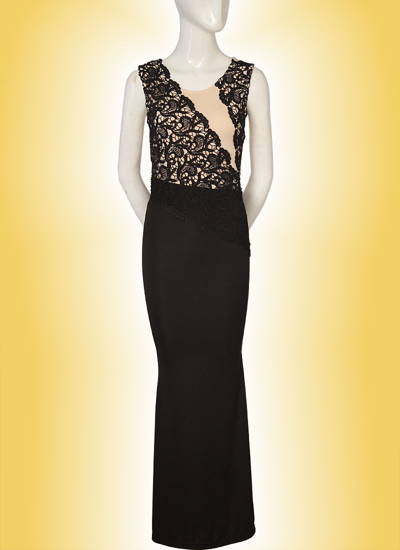 2014 ebay熱賣晚禮服 歐美新款黑色蕾絲拼接無袖長裙 女