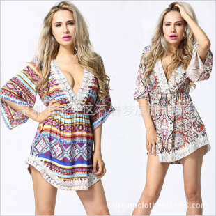 ¥31.002015速賣通爆款 歐美新款V領收腰蝙蝠袖寬松碎花印花花邊短裙