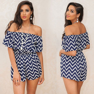 ¥35.00ebay速賣通新款波浪條紋一字肩收腰闊腿短褲裙 歐美抹胸連體褲