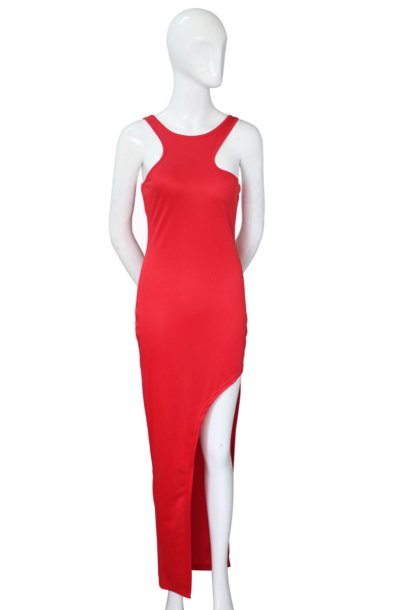 歐美新款性感修身不對稱背心長裙 下擺開叉連衣裙 Party禮服女
