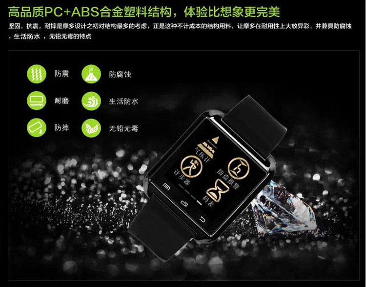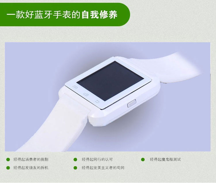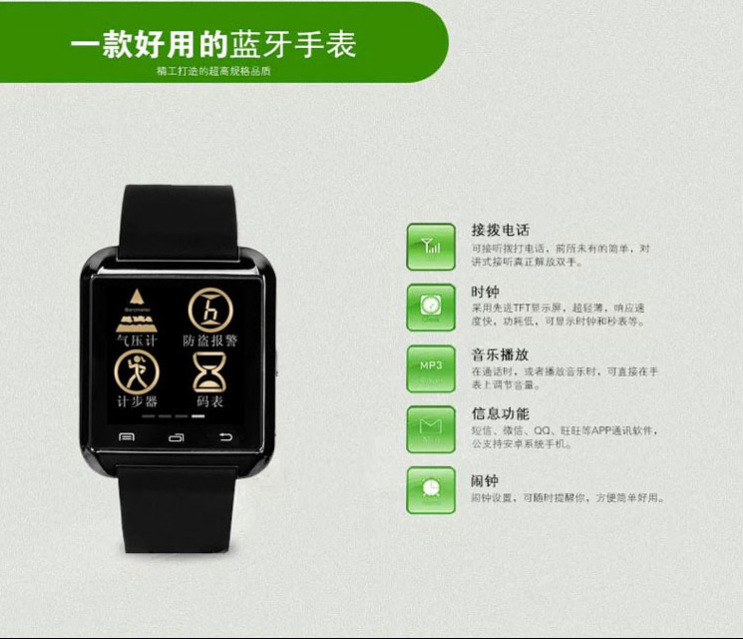 功能簡介:支持觸屏操作、有撥號盤可隨意按號撥打、同步手機電話本、同步手機mp3音樂播放、來電顯示、來電震動或鈴音提醒、計步器、氣壓計、高度計、秒表、鬧鐘、防盜報警,安卓的手機大部份可同步手機短信、QQ 微信等信息提示或查看、可遙控手機拍照。