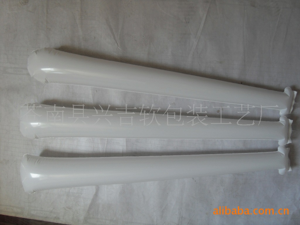 充氣棒用新引進高強度進口PE料制成,拉伸強度為130,耐磨不漏氣,兩棒敲擊可發出金屬音響,制造熱烈氣氛,鼓舞士氣,正反面可印全彩圖案或圖片,8色全自動電腦印刷機,印刷技術高超,色彩鮮艷,更能提高廣告效果.,充氣后自動封口。