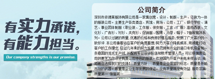 深圳市依德萊服飾有限公司是一家集創意、設計、制版、生產、訂做為一體的服裝公司。主要生產各類酒店、賓館、商場、公司、工廠、銀行、學校、演藝、事業團體制服(職業裝、工作服、保安服、工衣、廠服)、高檔西裝、文化衫、廣告衫、襯衫、夾克衫、促銷服、圍裙、馬甲、帽子、T恤等服飾系列。