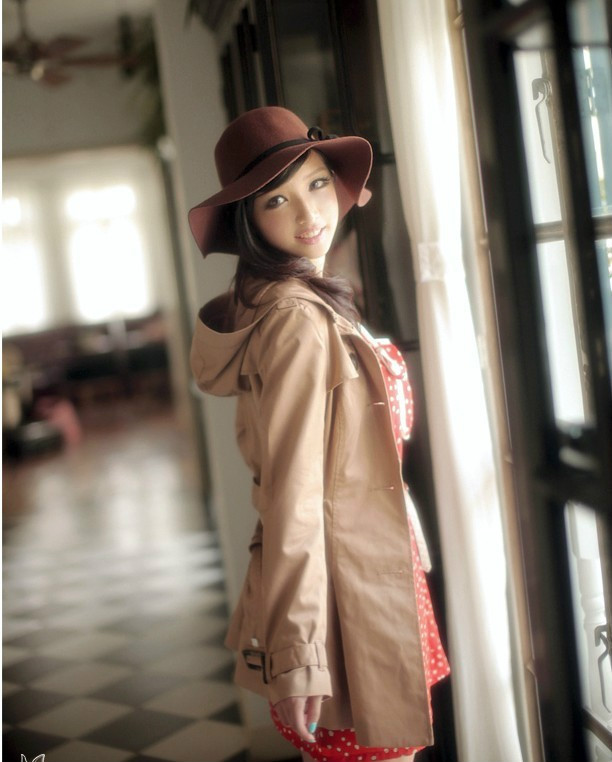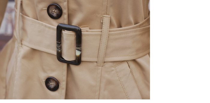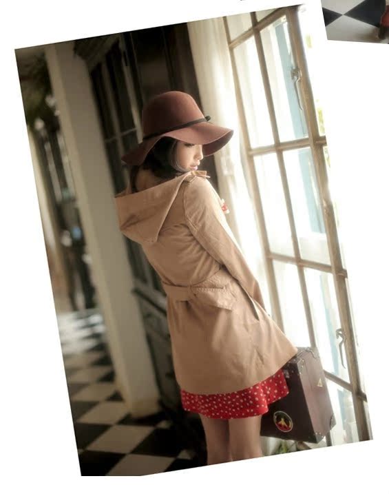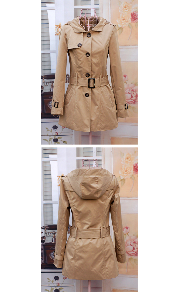 駝色來自于自然界的色彩卻具有一種非常都市化的味道,它是淡定的,就像一杯恰到好處的清茶,釅而不燥,淡而有味,是搭配中令人放心的底色——平和寧靜,但絕不乏味。連帽的修身式樣,適中的百搭長度,伴著袖口和腰間的帥氣腰帶式設計,束起腰封,立顯利落帥氣的休閑裝扮,盡顯高貴的優雅氣質。工藝上立體的剪裁,版型超贊,上身非常顯瘦哦!尤其是帽子的剪裁,時尚個性十足!面料上選用彈力斜紋質地,帶有柔弱光澤感的表層,伴著略微硬朗的質感更加挺立