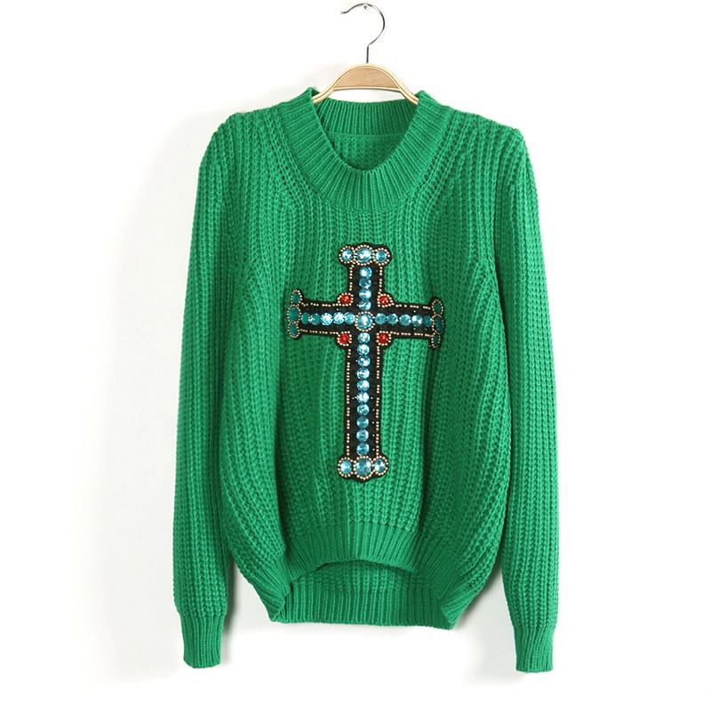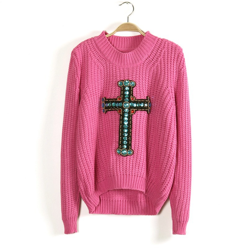 此款衣衣采用毛線面料、柔軟細膩的親膚感、透氣舒適、面料彈性大、豐滿的MM也可穿著的哦、身合身版型、前短后長手工釘珠十字架泡泡袖百搭套頭毛衣、靚麗動人、甜美可愛、雅致秀出玲瓏曲線美感、窈窕迷人、洋氣百搭、無論是甜美系還是休閑風的粉絲們、這款無疑是你們秋冬百搭的選擇單品、推薦喲~~