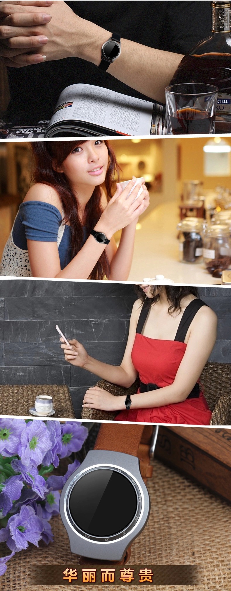 2.采用低功耗處理器,雙模工作方式,更長的待機時間 3.自主開發運動數據算法,提供更好的精度4.表殼采用航空級鋁合金精加工:拋光、噴砂、氧化及電泳5.特色點膠工藝,IP67防水跌落標準6.表帶采用PU(polyurethane)材料7.多種配件可選,滿足不同佩戴方式8.電池類型:2032紐扣電池9.顔色:銀灰、藍色、香檳10.外觀尺寸 直徑27.8x厚度8.9毫米(不計表帶尺寸)Specifications防水標準IP-x7外觀材質前殼、后殼:全鋁合金,手帶:軟膠主芯片EFM32G222FX藍牙芯片TI2541藍牙版本4.0BLE(低功耗)內存64KB RAM 64KB ROM傳感器重力加速傳感器電池CR2032(標準紐扣電池)時鐘指示12pcs LED燈軟件功能計步、測距、卡路里消耗管理、睡眠管理、運動量目標管理、時鐘顯示 防丟功能 測試心率 GPS定位 溫度儀 來電提醒 短信提醒 朋友社交排名 ,支持安卓4.3以上系統,IOS支持iphone4S以上機型。購買的朋友請注意這點!