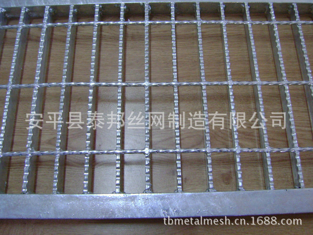 壓鎖鋼格板:有一定尺寸的普碳扁鋼、不銹鋼、鋁板經開槽(孔)、插接壓鎖、焊接、精整等工序制造而成。在承載扁鋼和橫桿的每個交叉點處,通過壓力將橫桿壓入承載扁鋼或預先開好槽的承載扁鋼中,將其固定的鋼格板叫做壓鎖鋼格板。壓鎖鋼格板的橫桿也采用扁鋼。