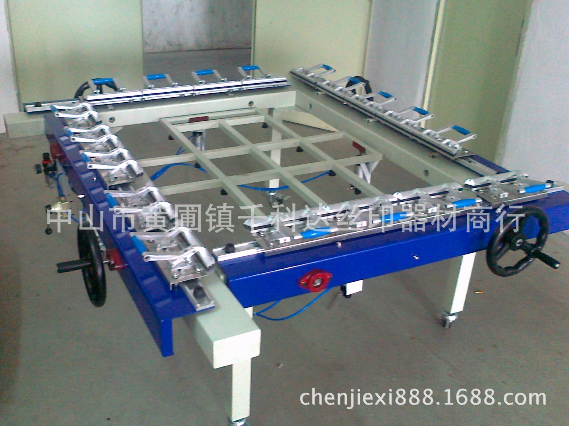 本機的優勢:帶減力裝置的拉網機,只需要輕輕的拉力就可達30牛頓以上.以上使用鏈輪,鏈條,絲桿傳動特性,可按照網布大小和鋁框的大小變換繃網架的尺寸;收循,擴大繃網架的尺寸.操作定位繃網平行移動不變形的好處,該機是制作廣告等大型網版和批量制版的理想機械.