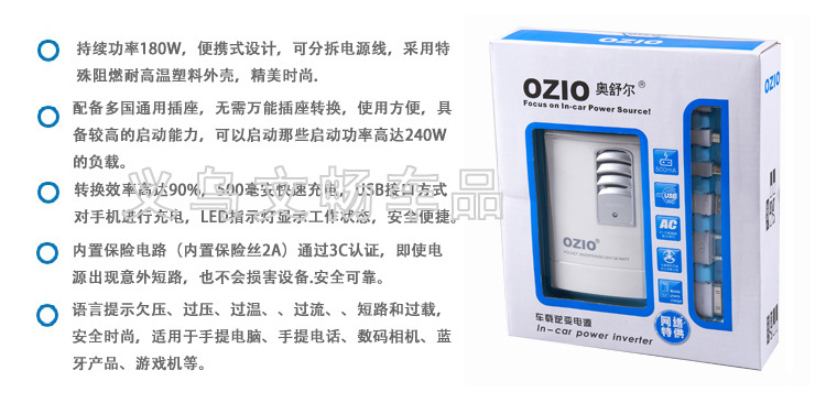 OZIO奧舒爾自主設計與研發的汽車電源產品有:車載電源逆變器、車載充電器、車載點煙器、汽車應急電源、汽車冰箱等產品。產品擁有十多個專利項目。