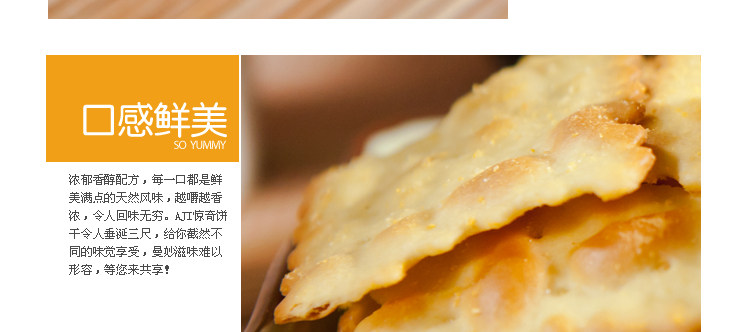 aji采用紐西蘭美味起士,以多道程序添加并結合造型獨特爽脆驚奇餅干,獨門提味配方,創造出驚奇的口味,令人垂涎三尺,給您截然不同的味覺享受!