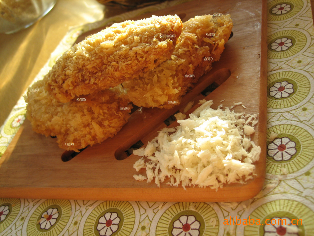 白色長針狀面包糠為業內傳統產品之一,源于日本。該產品及其系列呈中間寬兩頭尖狀,形似繡花針,裹炸而成的魚肉,雞肉等層次感濃厚,接近天賦羅迸發出的不規則立體效果。特別是對于面包蝦的制作,炸成品是根根金針排列整齊,有如龍甲鳳羽般映得金碧輝煌,口感更是酥脆有致,震撼齒齦之間。