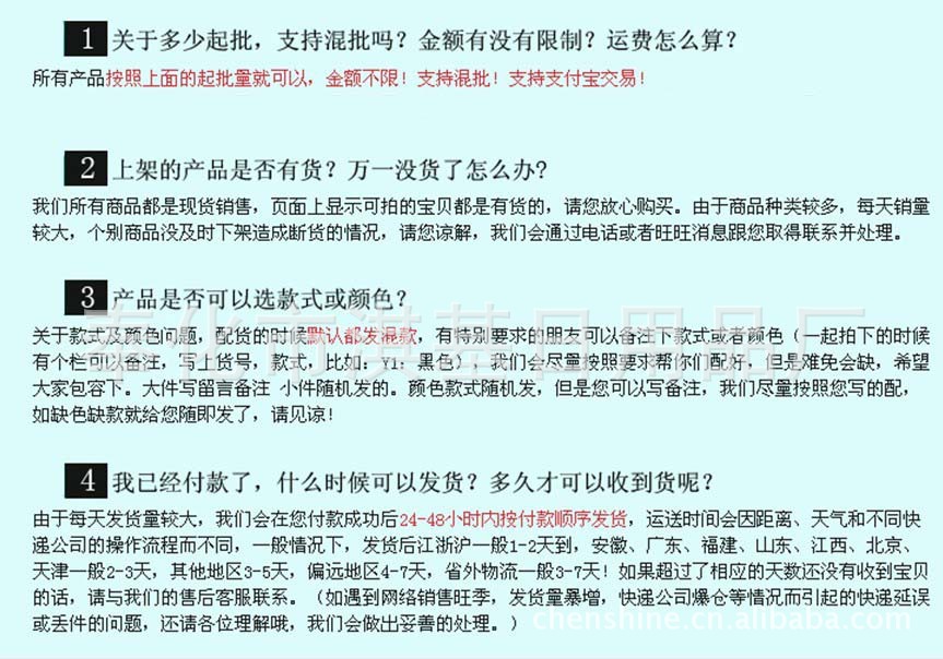 1、 本公司默認合作快遞公司為:申通快遞,圓通快遞,韻達快遞,順豐等具體咨詢客服。