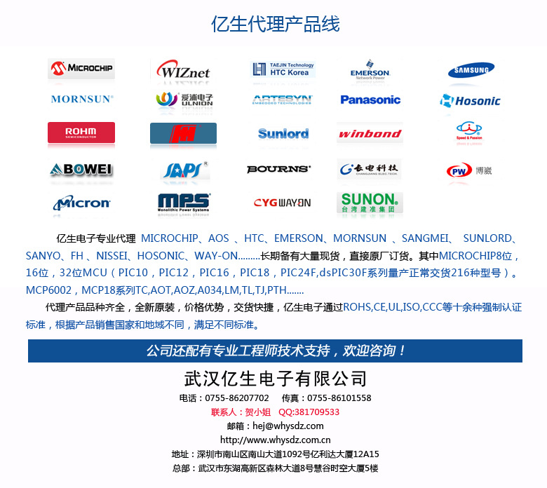 億生電子是Microchip、EMERSON、SANYO、Bourns、KVG、Hosonic、WAY-ON、BOWEI、MORNSUN、Sangmei、HTC、FH、Amphenol、Winbond、Samsung、Micron、Rami、CITEL等十多個著名公司的授權代理商和分銷商.