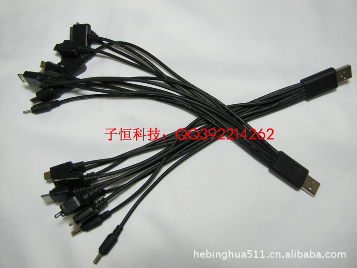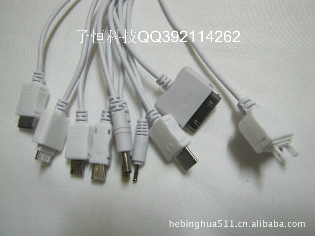 說 明:配10條現在手機的主流充電接口;配合車充頭(或充電頭,或電腦USB),即可實現充電.