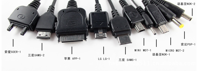 10個充電線接頭分別為:APP-1、LG-1、MOT-1、MOT-2、NOK-1、NOK-2、PSP-1、SAMS-1 、SAMS-2、SOER-1。