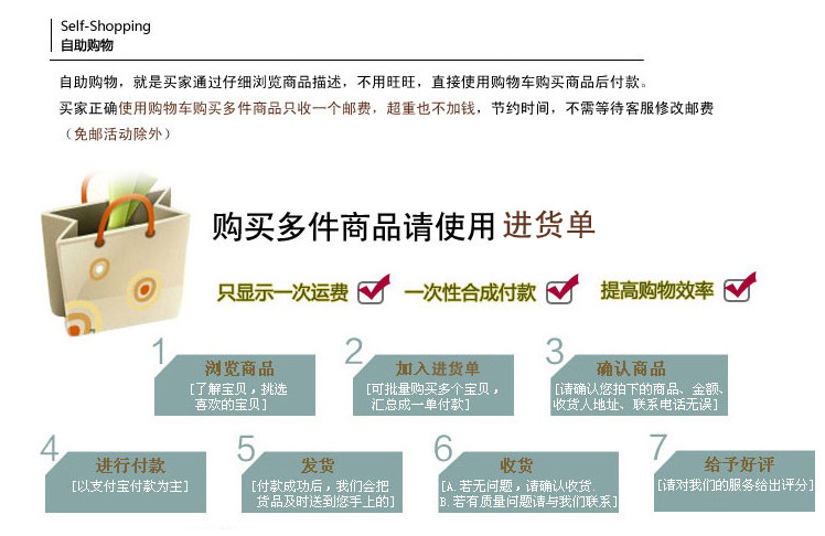 本店鋪都是低貨值易耗品,萬一有少發,漏發,損壞等造成的,將不支持補發,直接退款的形式作為補償。如果您對此不滿請別拍,謝謝!定做產品不接受無條件退款,常規貨無條件退換貨需要買家支付來回運費!
