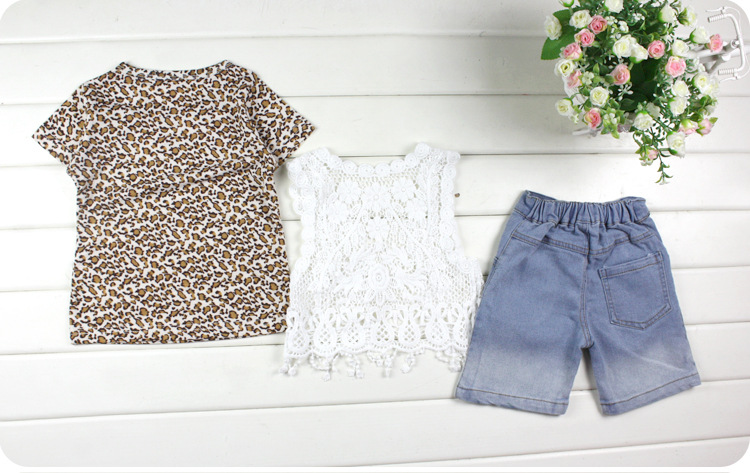 2015夏款預定 歐美女童豹紋短袖T 鏤空馬甲 短褲 發飾時尚四件套