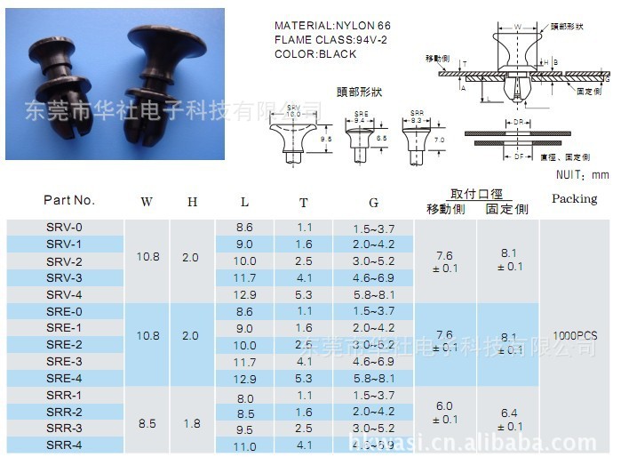 1、材質:UL合格之NYLON66(本色/黑色),防火等級94V-2;