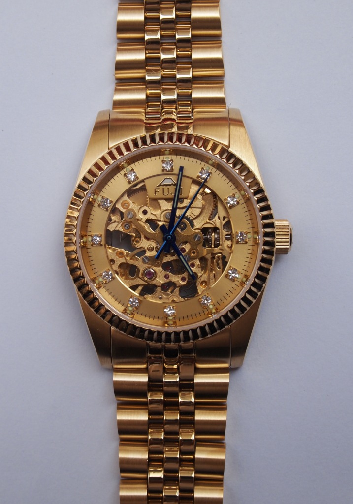 日本316L精鋼表殼、表圈,全實心不銹鋼五珠表帶,殼、圈、表帶真空電鍍18K真金,藍寶石玻璃,日本原裝進口全自動鏤空金機芯,30米防水(鄭重聲明:30米防水不是其他商家說的生活防水,而應該是在三十米深的水壓下不進水,因為正歸的工廠在裝配時都會用試水機高壓試水,既然標明3ATM,本身就應該達到30米水壓的防水要求,試問:誰能游泳至30米水深處?所以,達到30米防水要求的話,在生活當中是不需要取下來的,除了到海里游泳和高溫桑拿需取下,一般環境都可以戴在手上,如果商家不敢承諾這點,其產品就帶有虛假的成份!敬請留意!