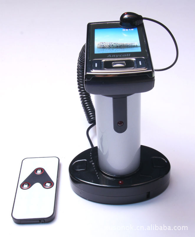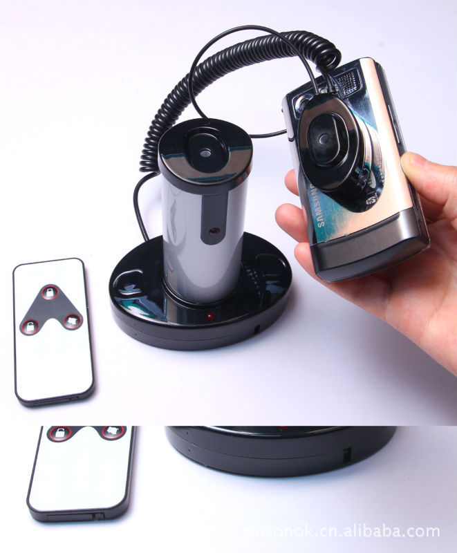 手機、數碼相機、MP3、MP4、GPS等數碼電子產品實際陳列于本品上,本產品由報警主機、報警探頭、展示支架等組成。報警主機安裝于展示架或陳列柜上,報警探頭則粘附于展示產品上。顧客可以方便的從架子上取下陳列品,自由的對陳列品的功能和外觀進行操作和試用,如果顧客想將陳列品拿走,報警器會立即發出持續的報警聲,報警聲將持續到管理人員來做復位處理為止。