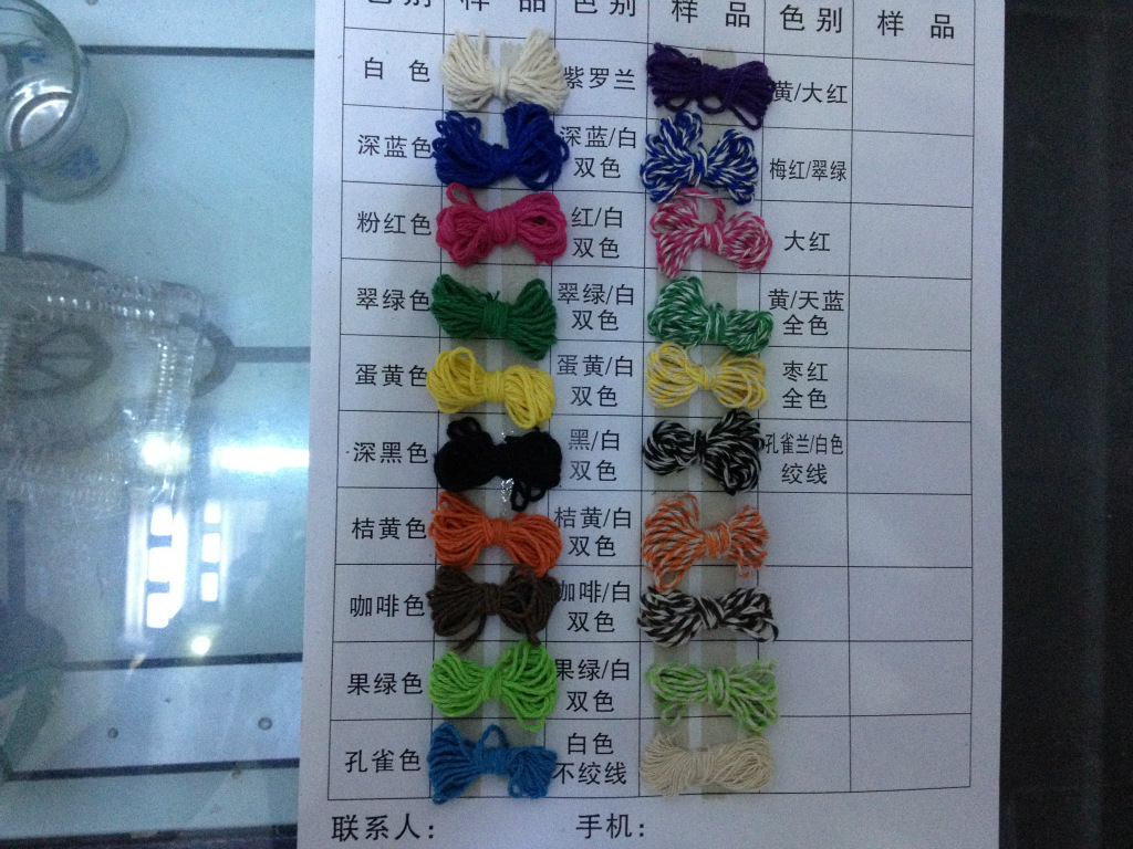 你好, 我們是一家專業生產粽子扎線,經國家相關部門批準注冊的企業。我廠以雄厚的實力、合理的價格、優良的服務與多家企業建立了長期的合作關系。熱誠歡迎各界前來參觀、恰談,我們會以優良的服務,可靠的質量滿足您的需求。也可做某一地區代理。我廠主要生產銷售10支4股純白絞線,梅紅白,果綠白,黑白,翠綠白,天藍白,黃白,桔黃白,孔雀藍白等各種4股花色絞線,全紅,全果綠,全黑,全翠綠,全天藍,全黃,全桔黃,全孔雀藍等各種4股全色絞線。21支8股【根】純白絞線,梅紅白,果綠白,黑白,翠綠白,天藍白,黃白,桔黃白,孔雀藍白等各種8股花色絞線,全紅,全果綠,全黑,全翠綠,全天藍,全黃,全桔黃,全孔雀藍等各種8股全色絞線。扎線的顏色多樣,可以更好的區分各類粽子,再則棉線質地較軟,在滿足牢度的同時,對包粽子的工人的手傷害較其他扎繩要小很多,另外我廠也可以來樣定做貴公司的產品,有意者可以連系我們,聯系電話【0】沈先生 0573 良好的質量與優質的服務始終是我廠的宗旨,希望我們能成為朋友,互利雙