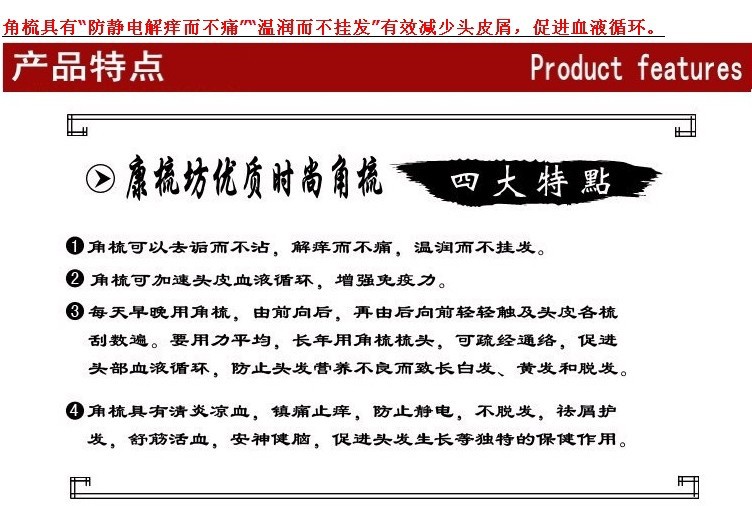 【產品介紹】牛角梳頭能在按[mo]大腦頭皮和頭部神經時促進血液循環,無形中滲入人體,經常使用角梳能有效的減少脫發,斷發及消除頭皮屑,頭部是人體的統帥,一定要用的方式去護理。