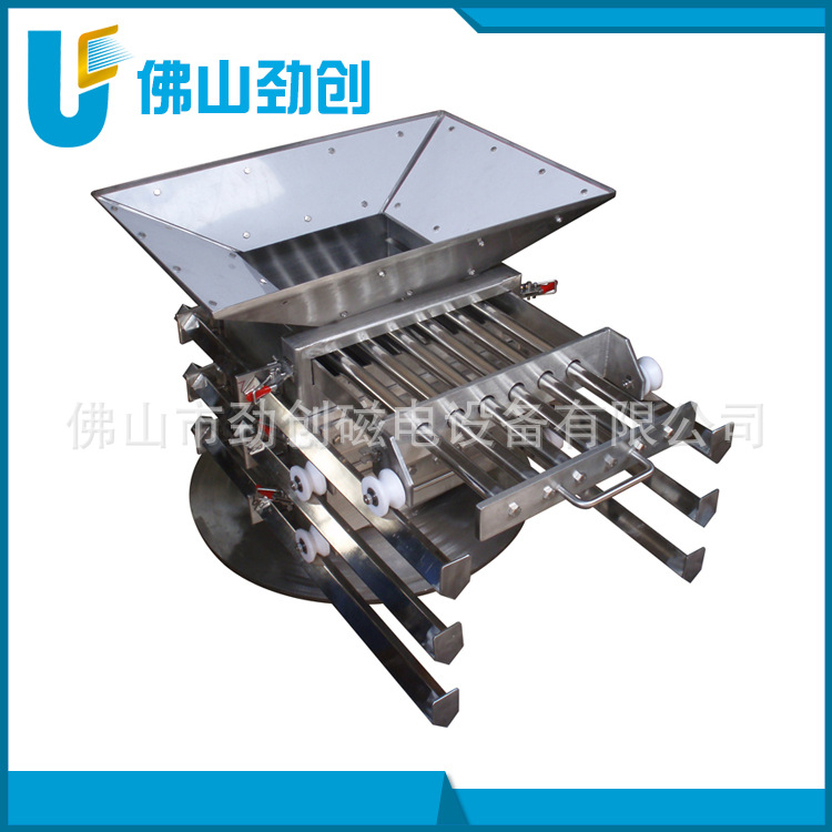 無能耗、無污染、結構簡單、可安裝于生產線輸送管道中或出料口處,節約空間,安裝方便,磁棒采用交錯式排列方式,磁間距設計周密,使強磁區域得以更加充分的利用。