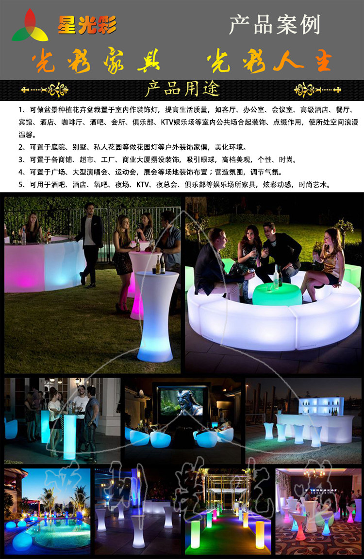 本公司供應酒店、酒吧、戶外、會所等專用的發光家具,如椅子、凳子、桌子、沙發、酒架、花盆、圓圈、管、球、裝飾燈、裝飾品、果盤、冰桶、枕套、桌布、椅套、窗簾。