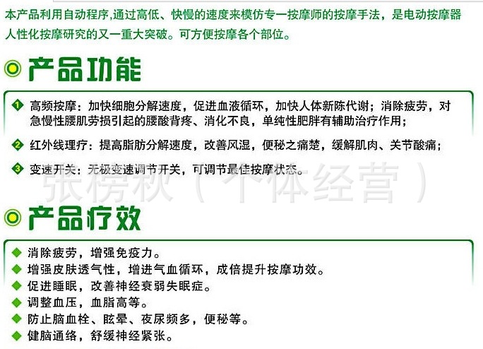 詳細介紹:本產品外形設計為大型按[mo]器,力度更大,按[mo]部位更多,可充分按[mo]頸椎、肩膀等部位;另配8個按[mo]頭,腰部及腿部等部位進行重點按[mo] 。