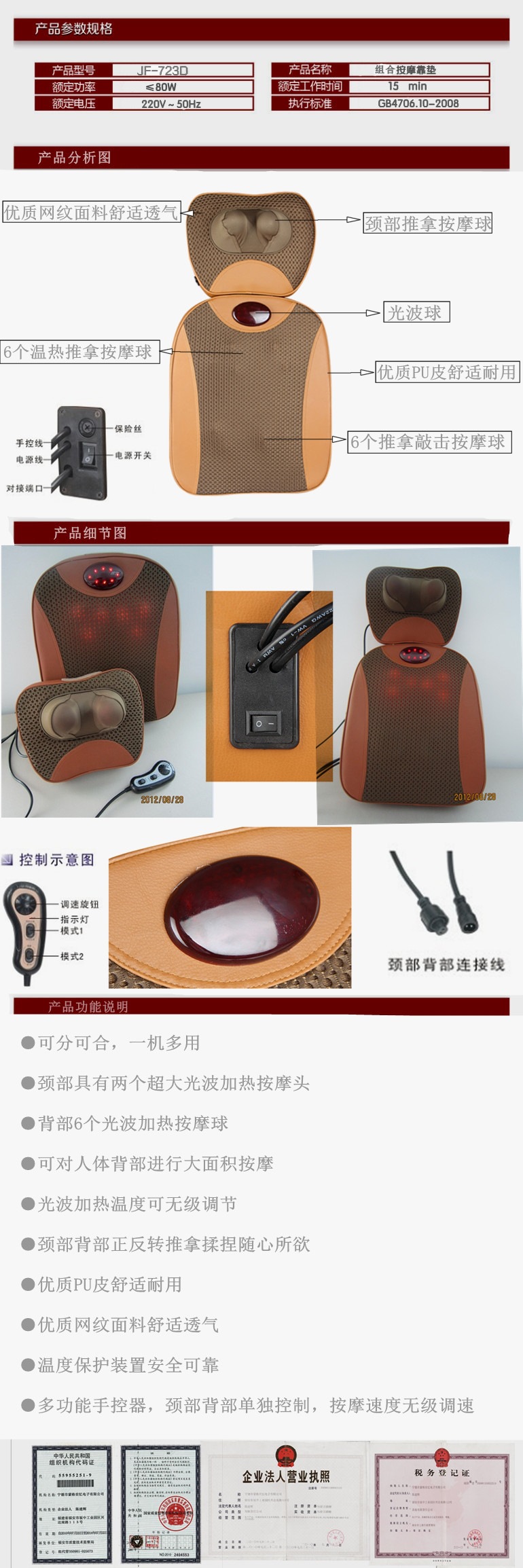 按[mo]墊特有捶打,指壓,拍擊三中種按[mo]方法。 微電腦控制,二十分鐘定時功能,設計輕便適合家庭、辦公室、汽車內使用。 松緊帶固定法適合于任何椅子, 將身體靠近按[mo]墊(或坐躺),按[mo]墊開始工作,然后按部位選擇鍵選擇按[mo],如腰部,頸肩,背部,腿部等部位可選擇定點,也可以五個部位同時工作。