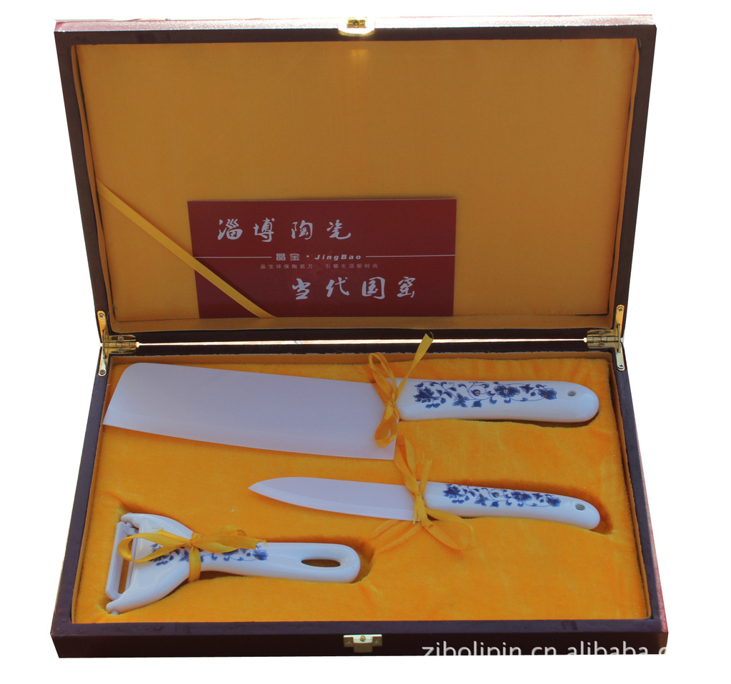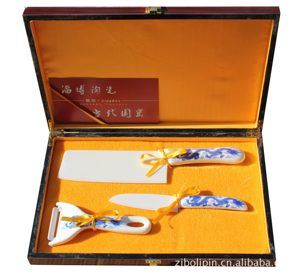 下面金星青花3件套陶瓷刀禮品包裝套裝打開后的效果圖