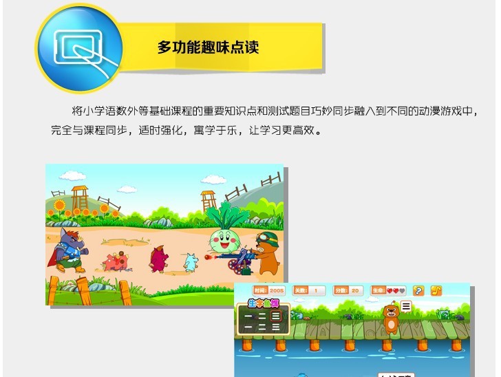 將小學語數外生字、單詞等知識點和測試題目巧妙融入到不同的動漫游戲中,讓學習趣味更高效。
